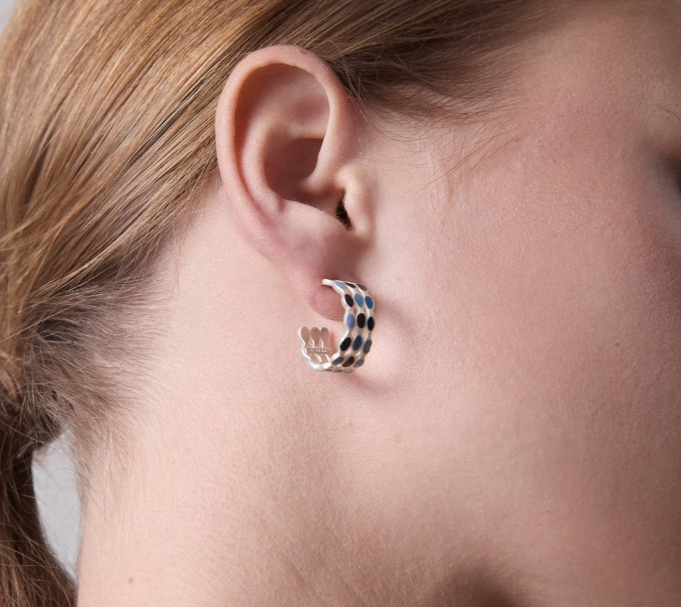 Aros abiertos de plata de 925 y esmalte frío multicolor. Díselo de líneas de puntos imperfectos de intensos colores en tonalidades azules. Inspirado en el Rocío matinal. Cierre con presión.