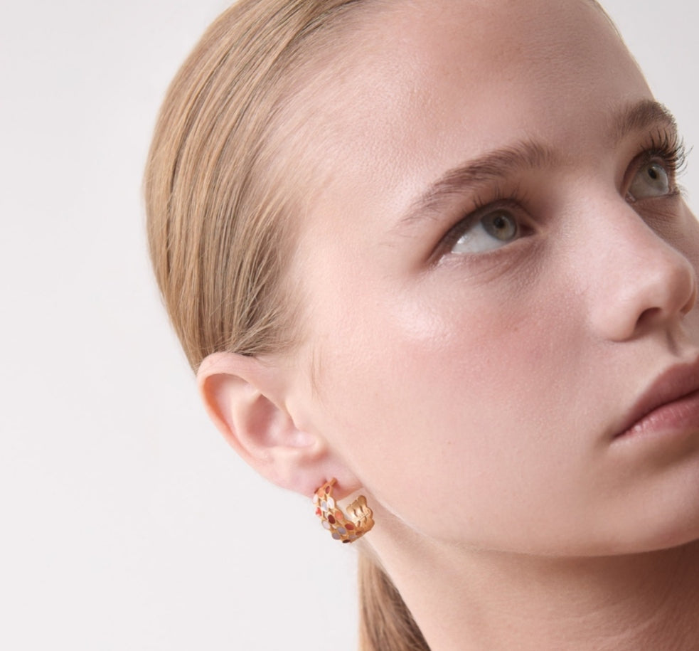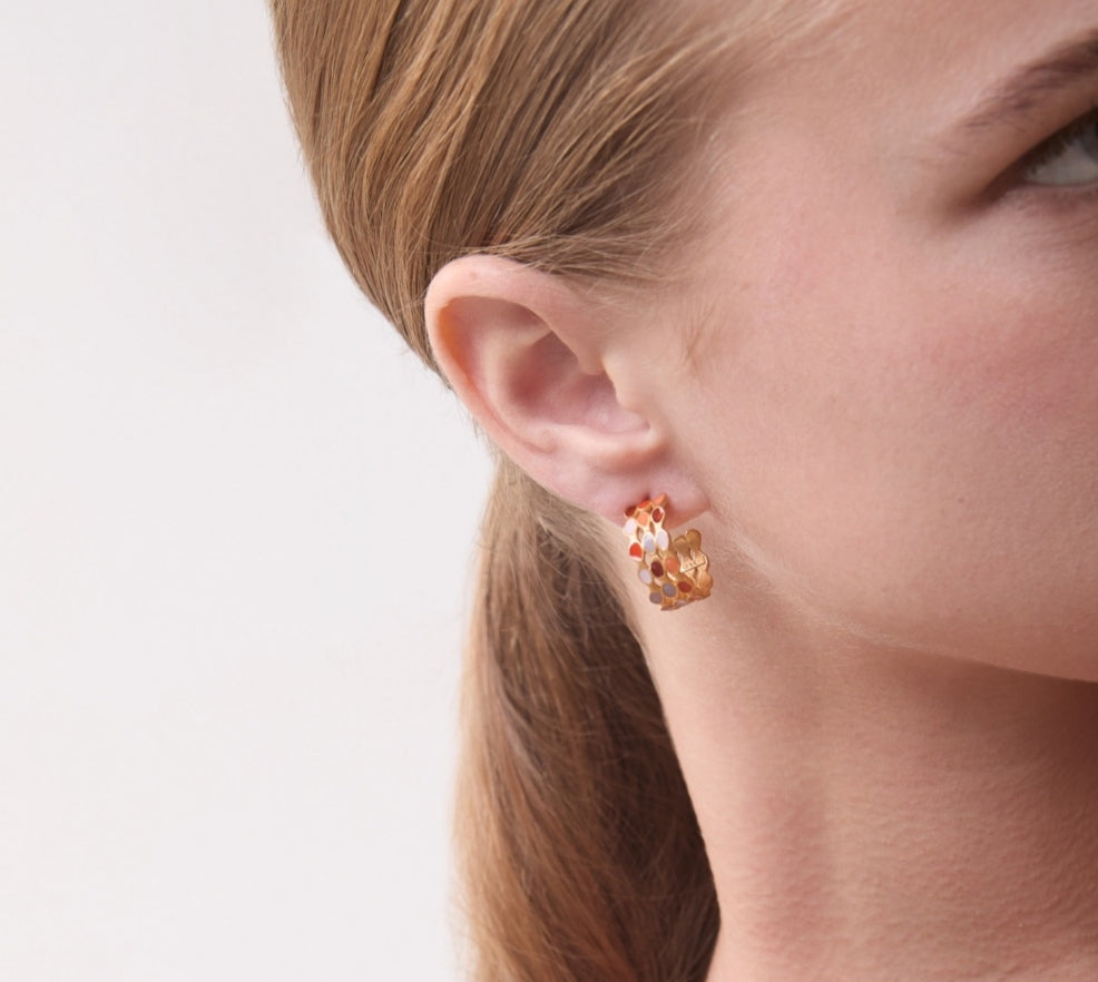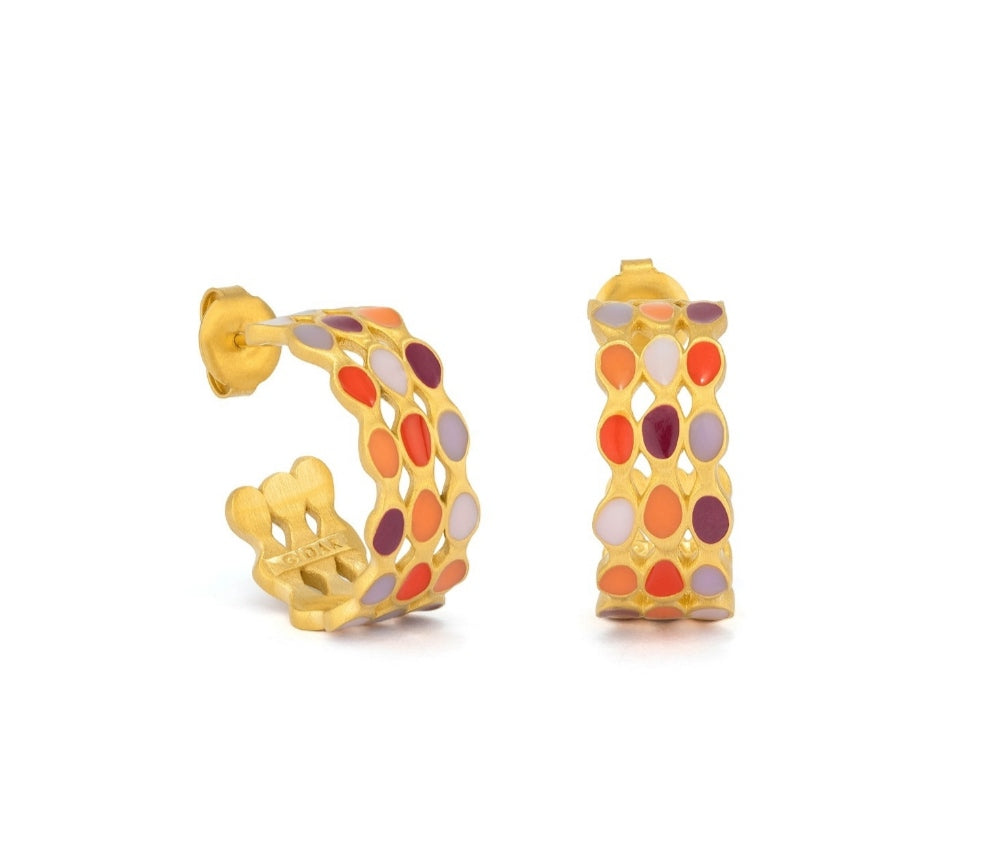 Aros abiertos en latón con baño de oro de 24K y esmalte frío multicolor. Diseño de líneas de puntos imperfectos de intensos colores en tonalidades calidas. Cierre con presión.