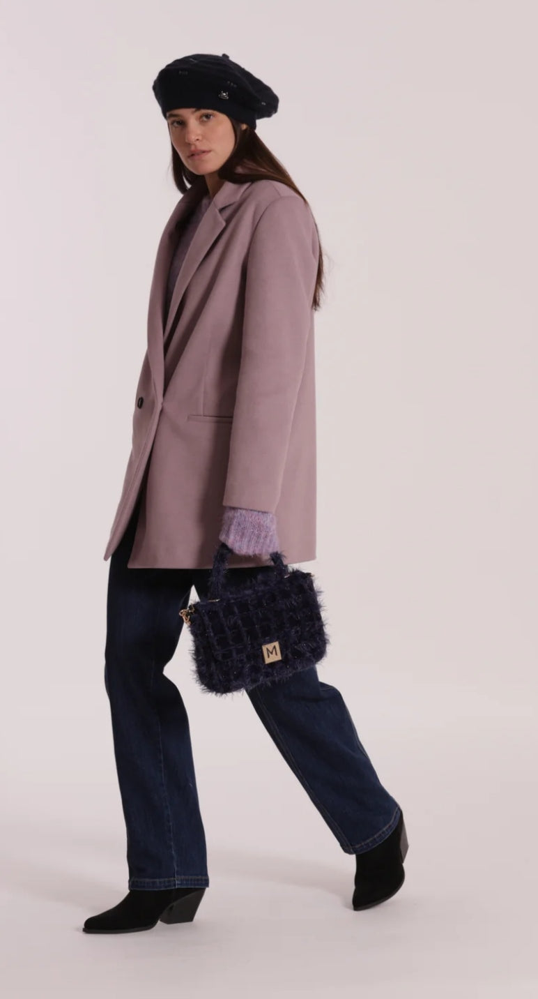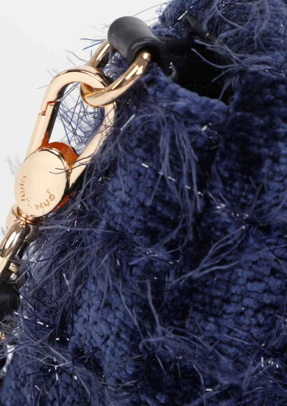 Bolso de hombro de tweed azul, para llevarlo de mano o colgado con cadena que le proporciona un look más urbano. Un bolso que diferencia cualquiera estilo.