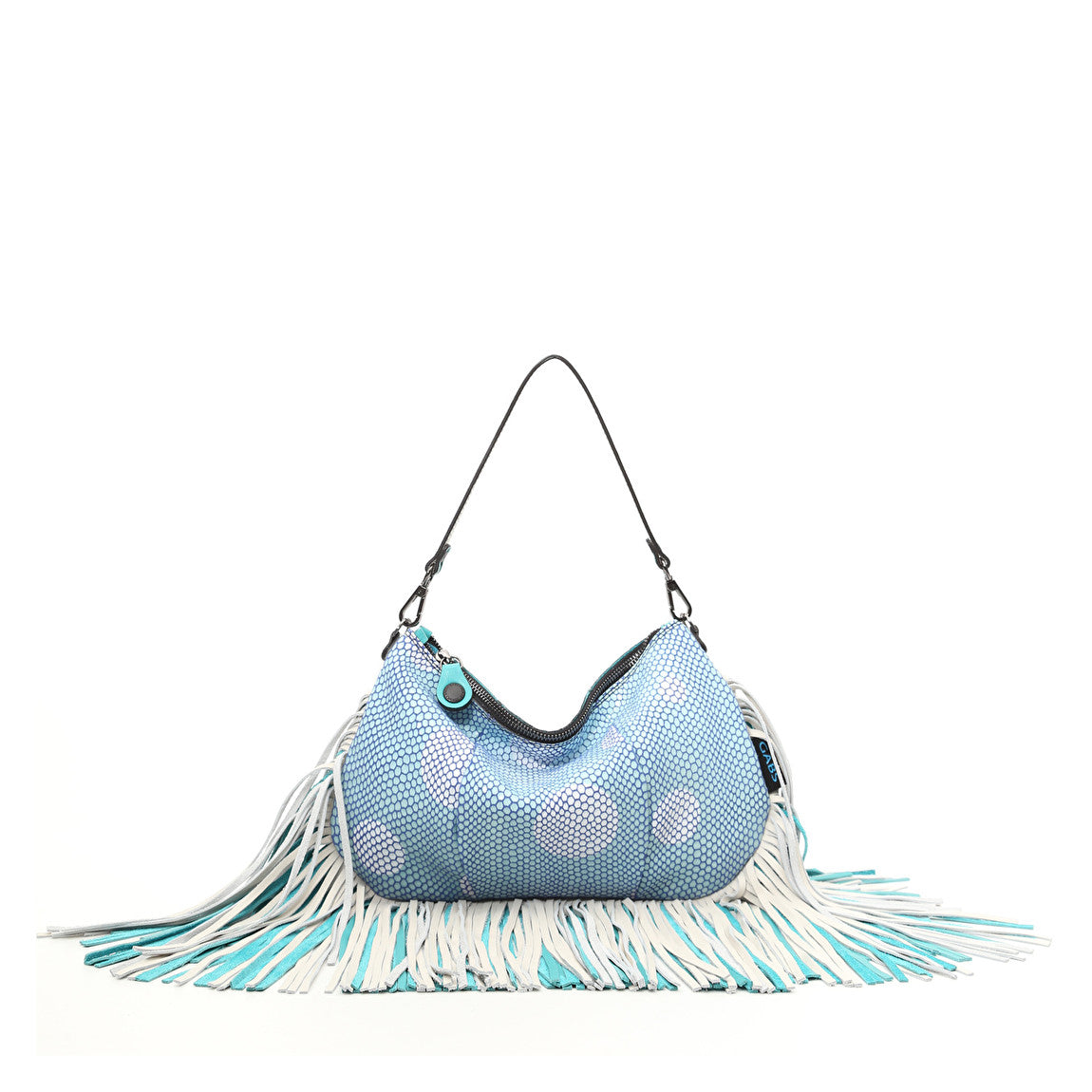 Bolso al hombro de piel bicolor fantasía lunares azul y turquesa.