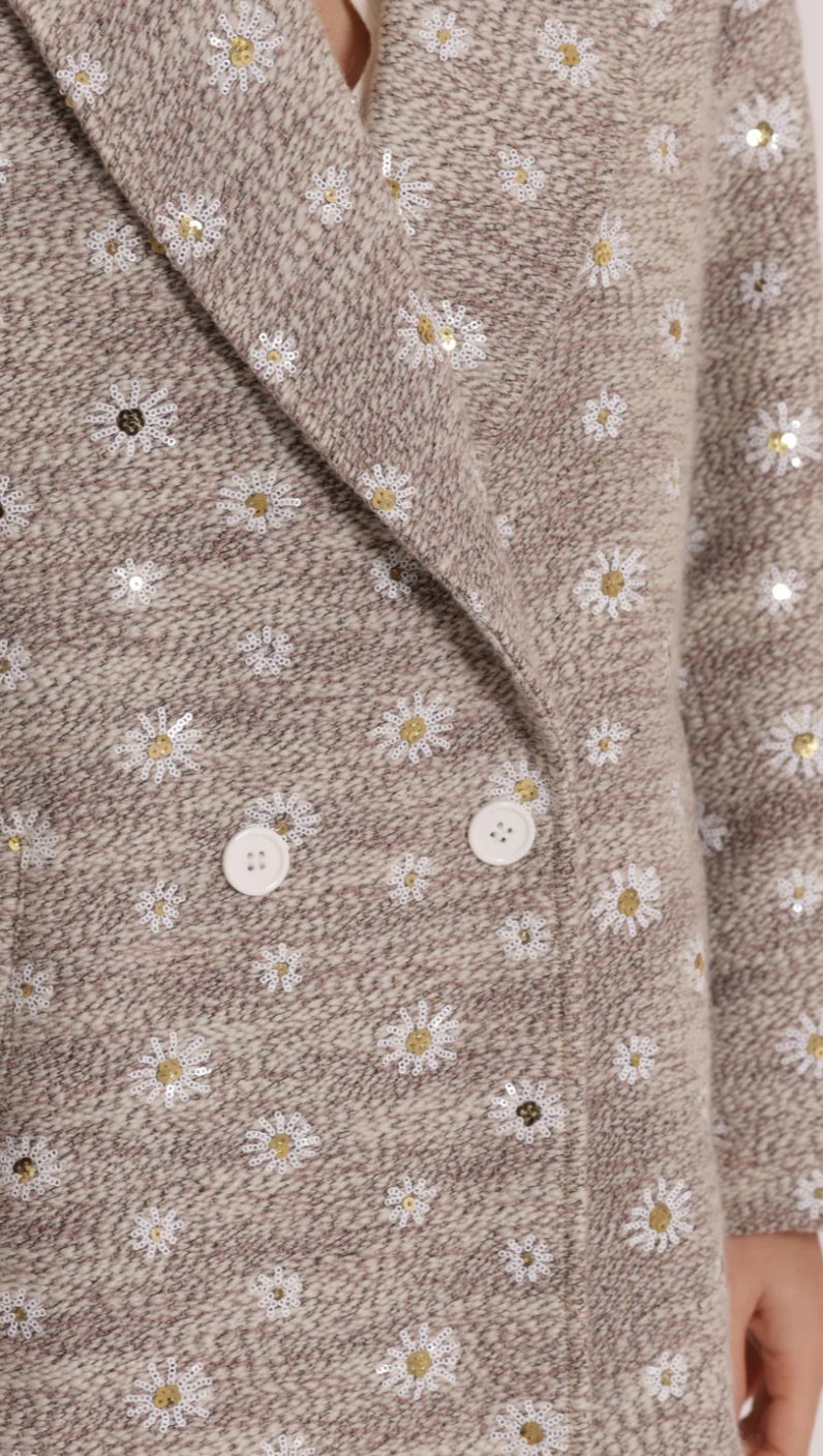 Chaqueta de abrigo en tonos suaves y margaritas de lentejuelas. Con solapa y bolsillos laterales.