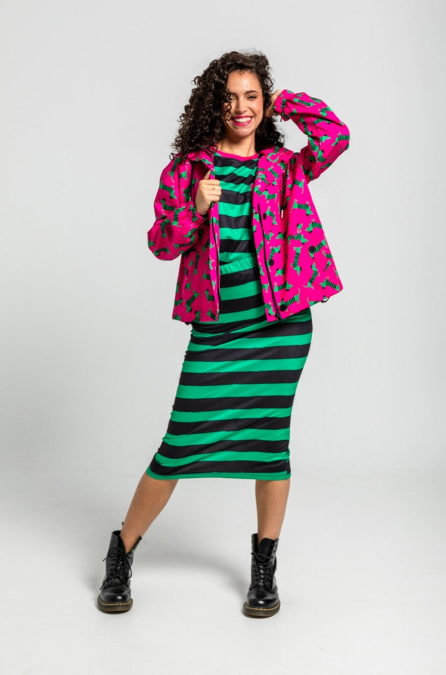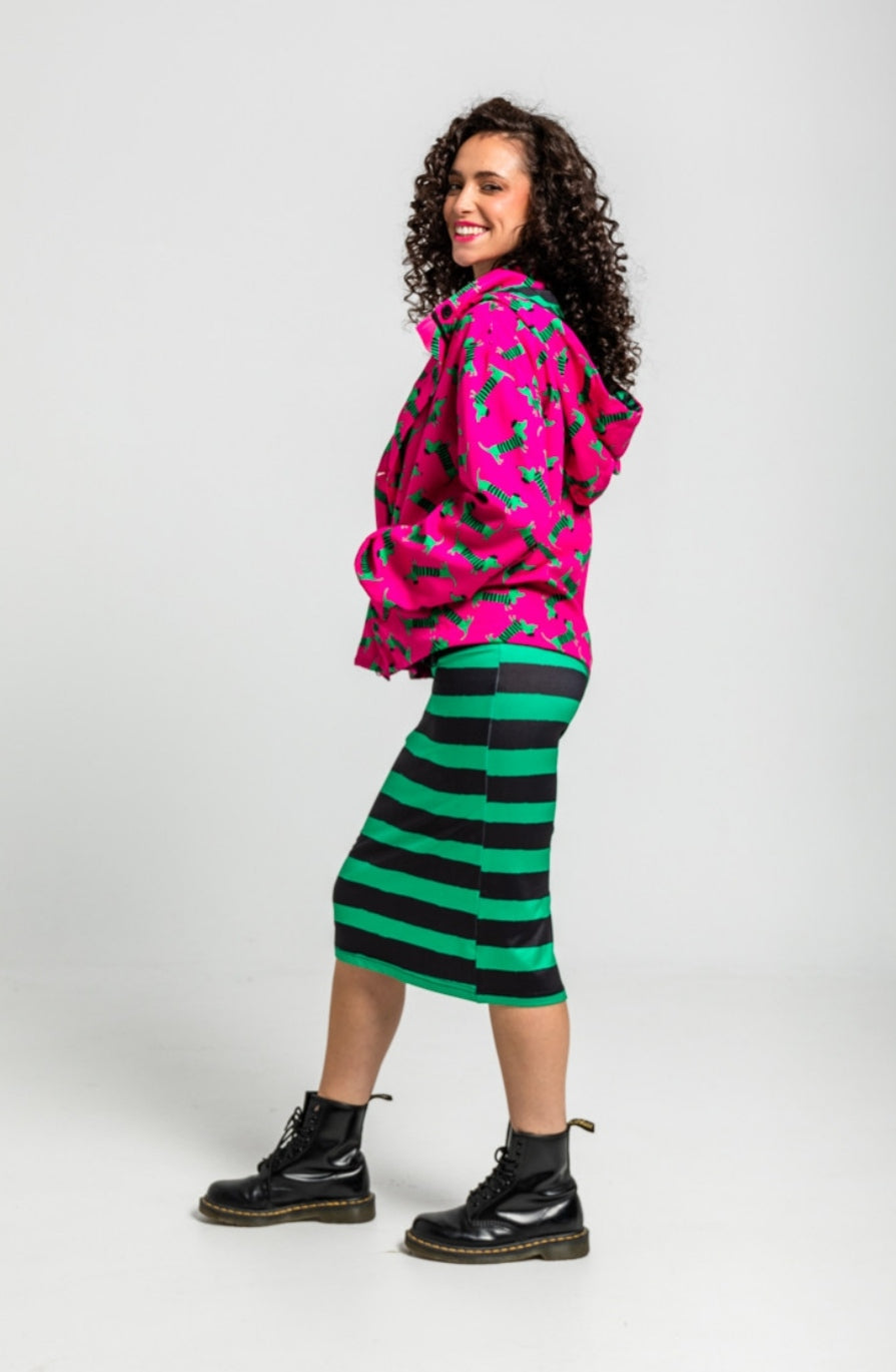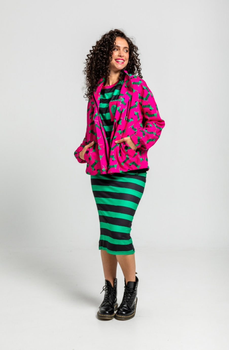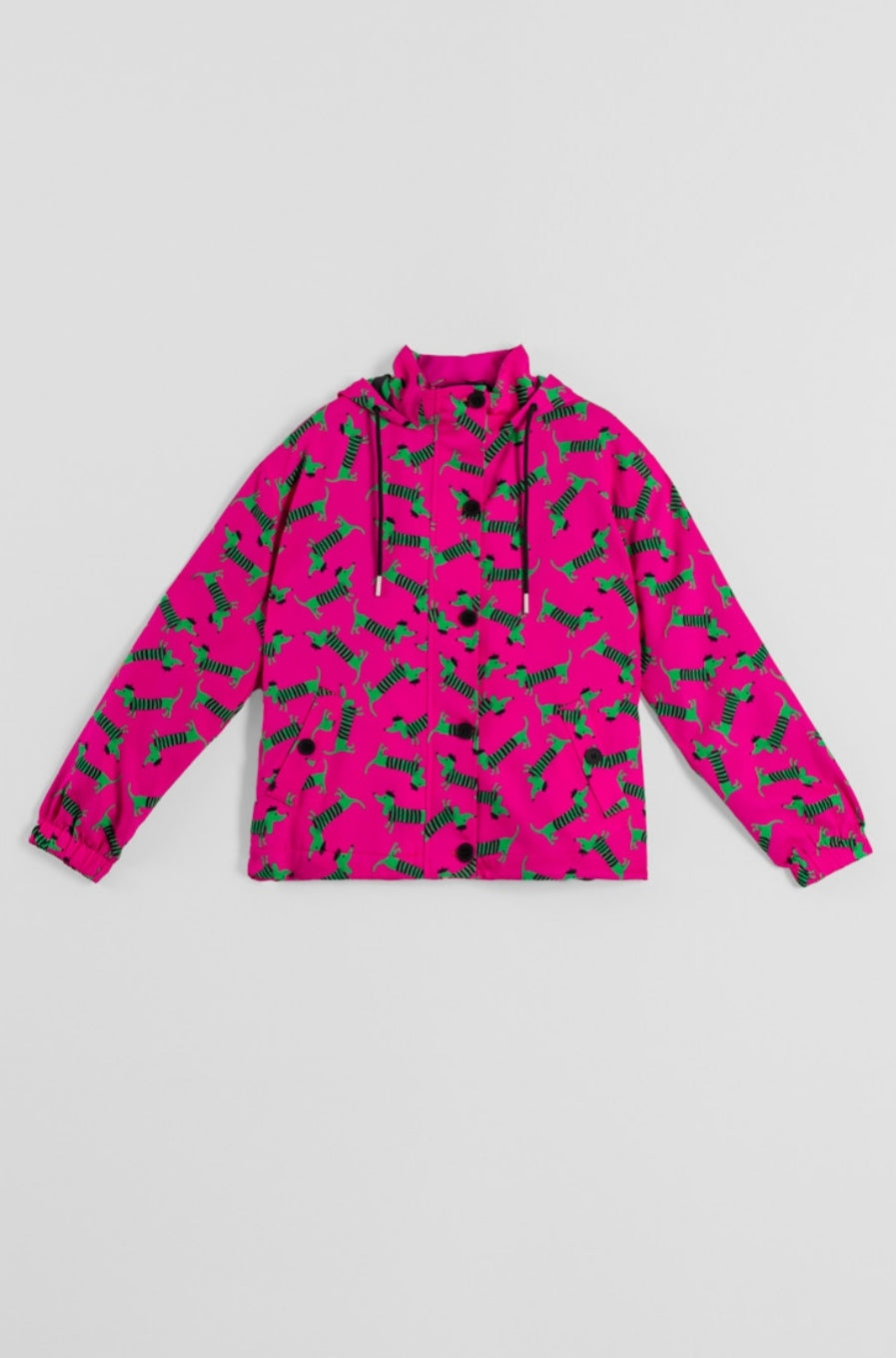Chaqueta capucha de rayas negra/ fucsia, cuello elevado, capucha ajustable con cordón y botón con protección para la barbilla. Bolsillos delanteros botón de presión con solapa y elástico revestido en los puños.