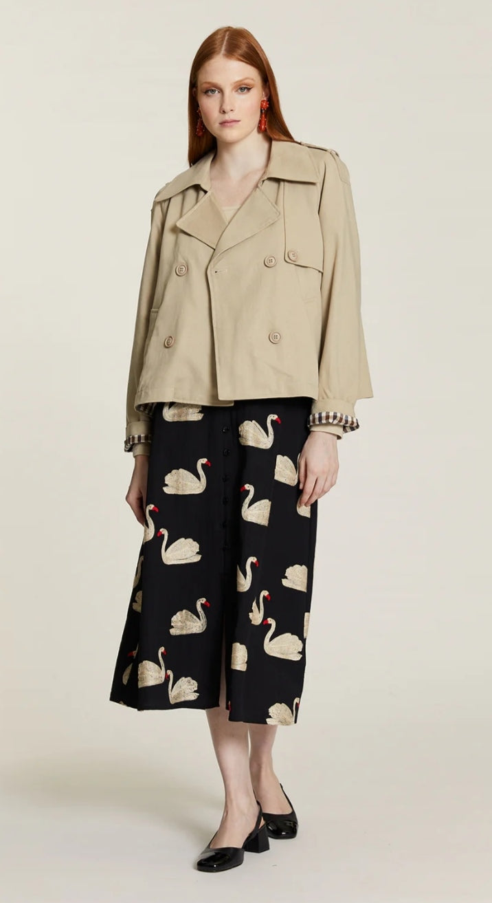 Falda negra con bordado de cisnes, botones decoración y raja en la parte delantera, cinturilla elástica en la parte trasera.