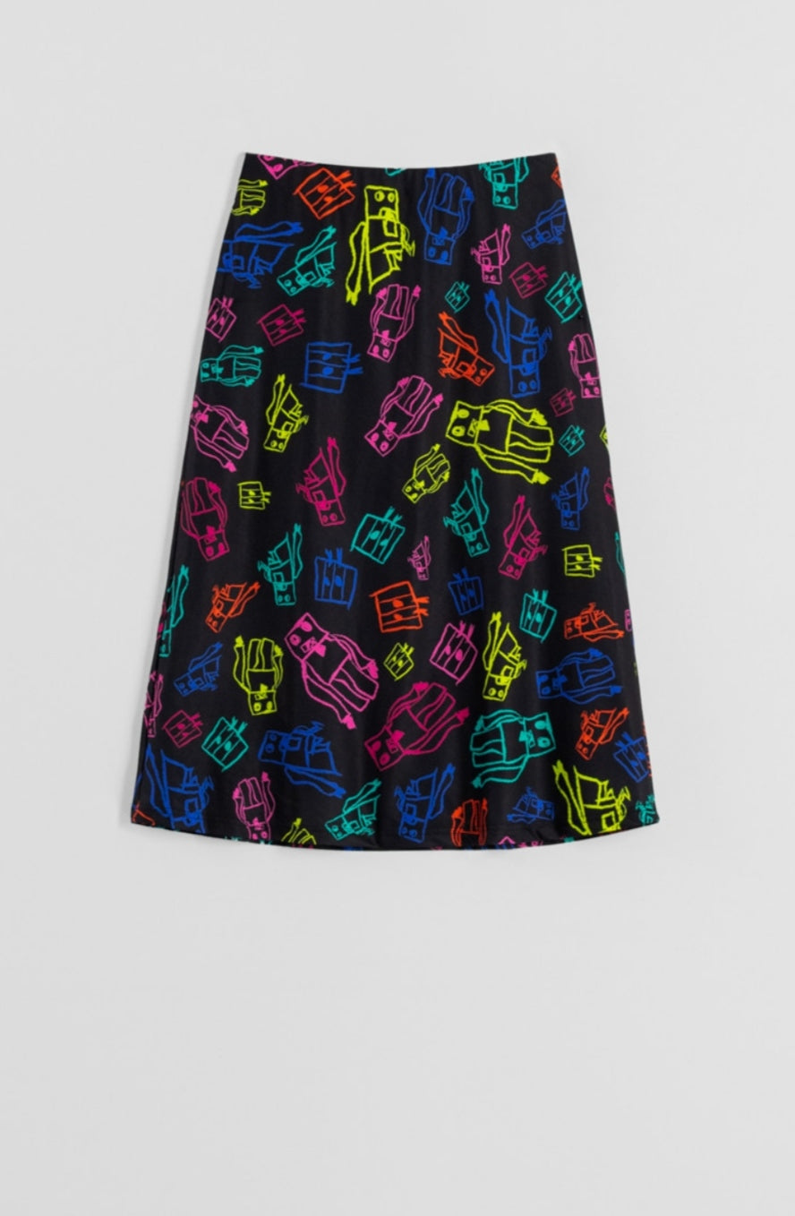 Falda evasé de tejido fluido, goma en cintura y ligero vuelo en el bajo.