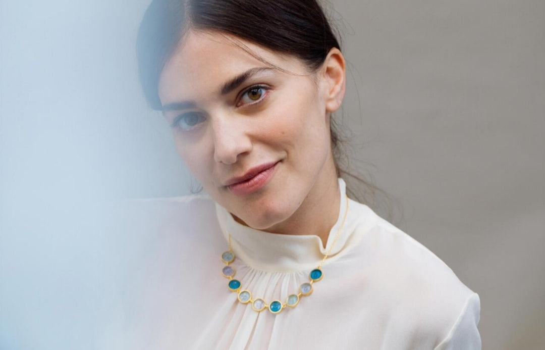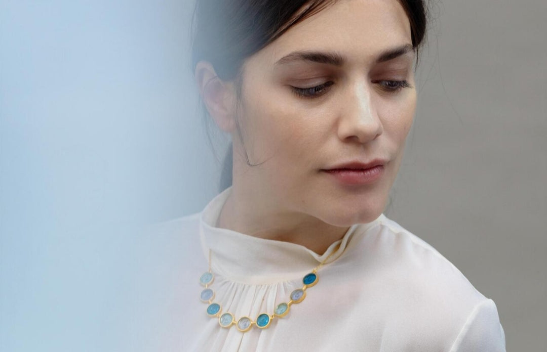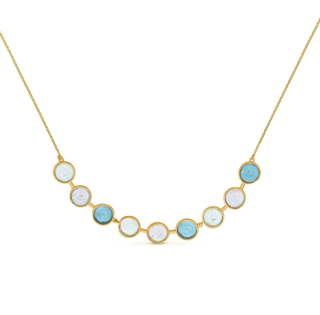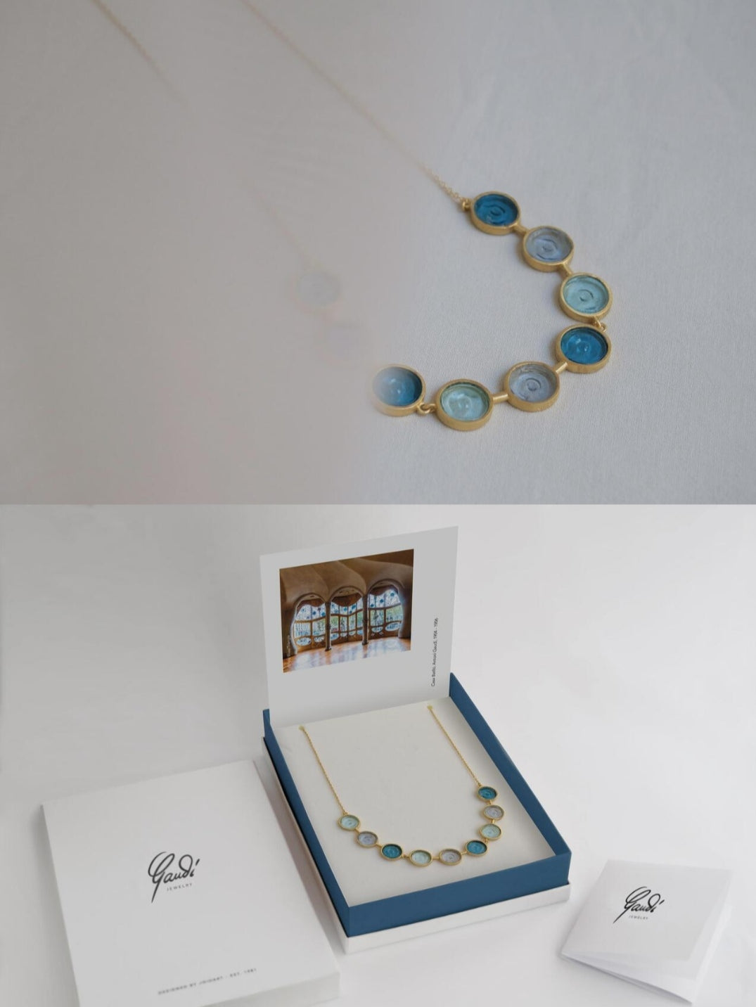 Collar de metal mate dorado con baño de oro de 24K, formado por varios círculos de vitral de Murano artesanales, de diferentes tonalidades de color azul. Diseño inspirado en la cristalera de la Casa Batló, obra del arquitecto Antoni Gaudí, del año 1904.