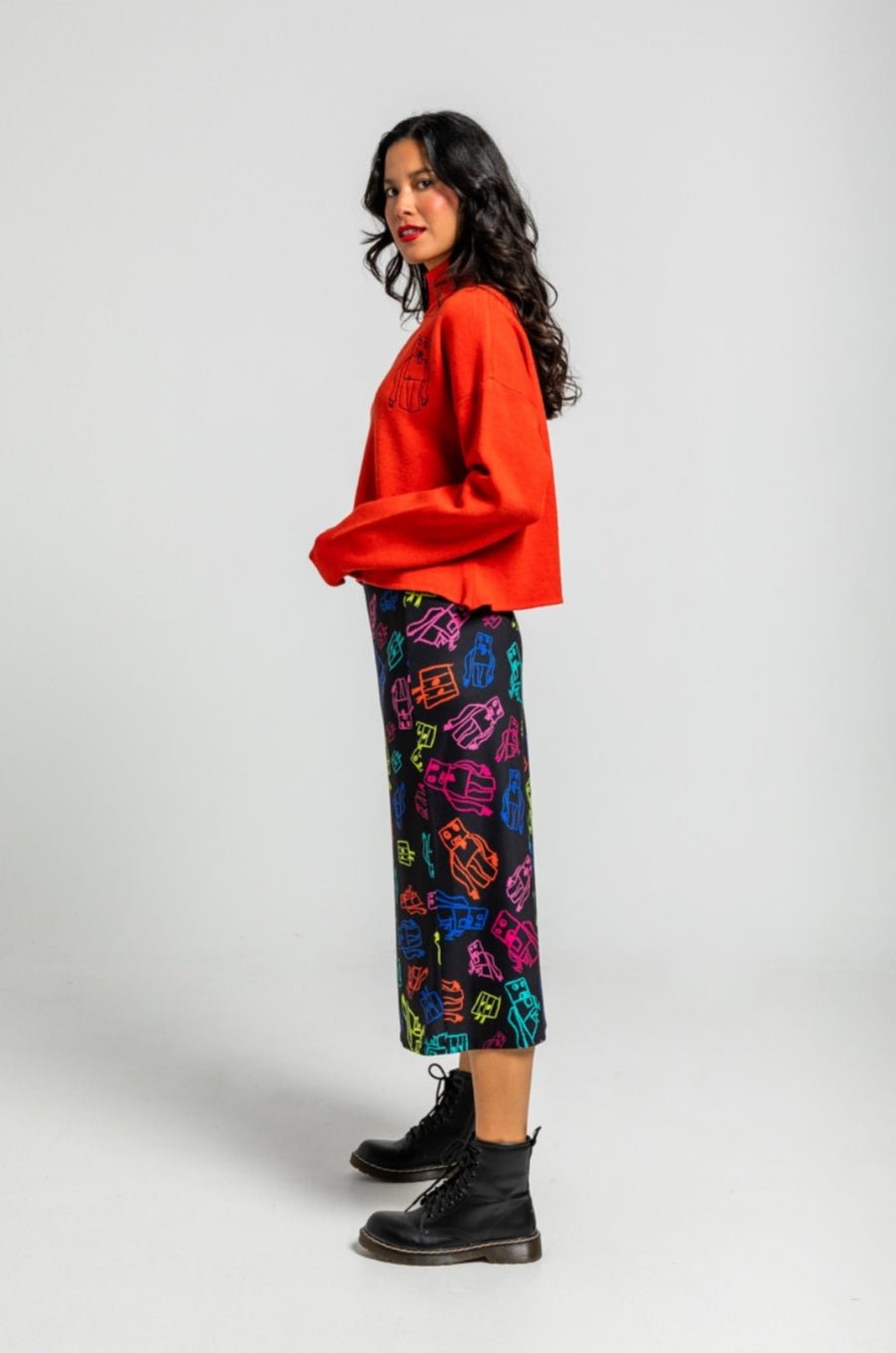 Suéter crop; jersey de punto suave con ilustración vectorial tejido. Modelo de jersey amplio y tipo crops con cuello perkins, hombros marcadamente caídos y mangas anchas.