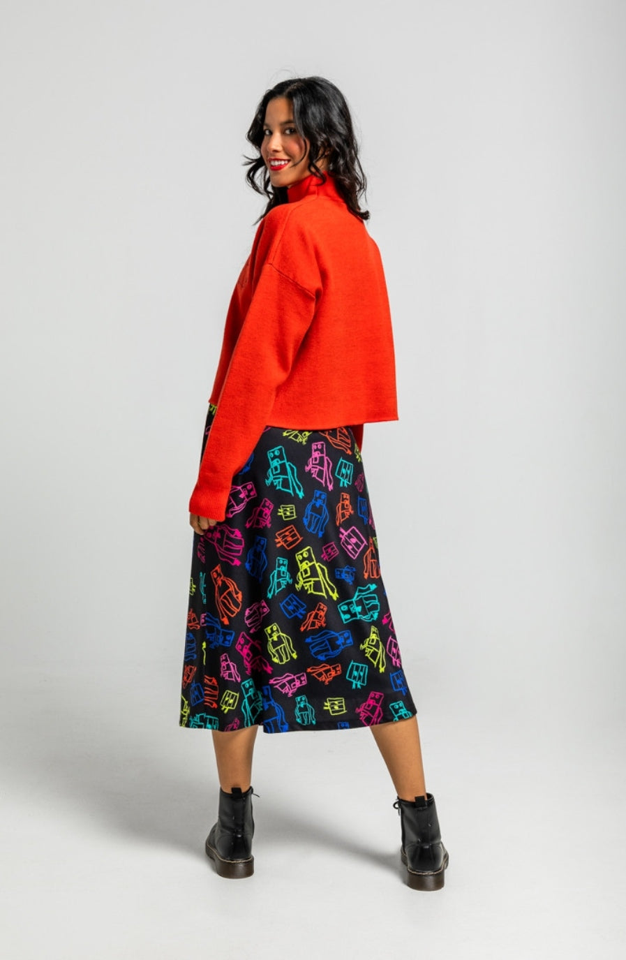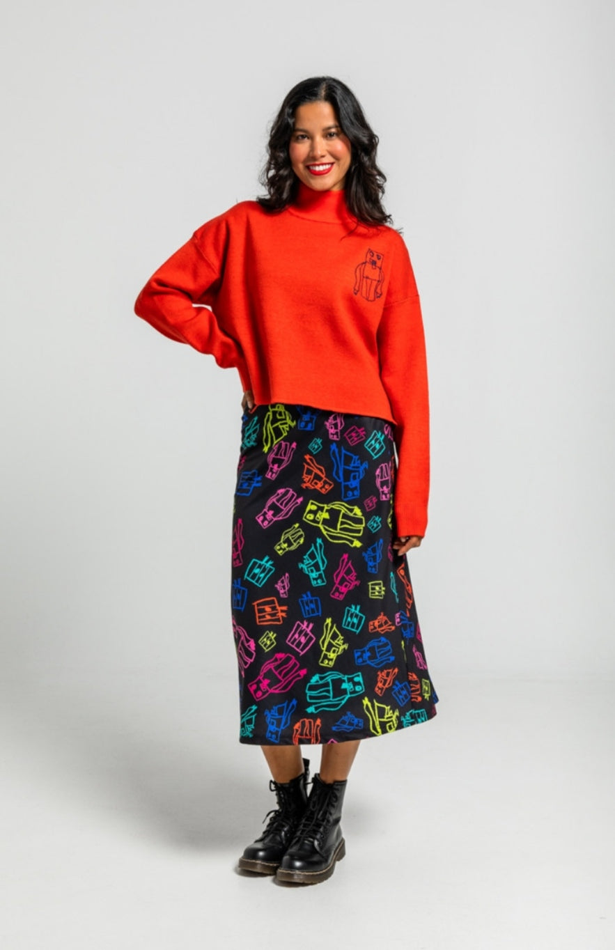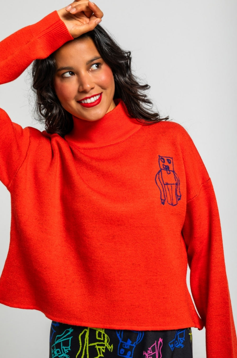 Jersey de color naranja y con el robot diseñado y creado por uno de los maravillosos niños de un centro de acogida de Granada al que irán destinados parte de los beneficios de esta colección.