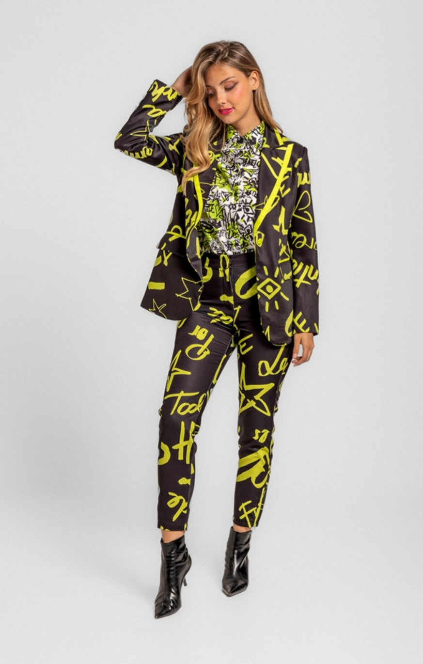 Blazer con estampado colección DESCARADA, con ribete en verde. Cierre de botones y bolsillos frontales.