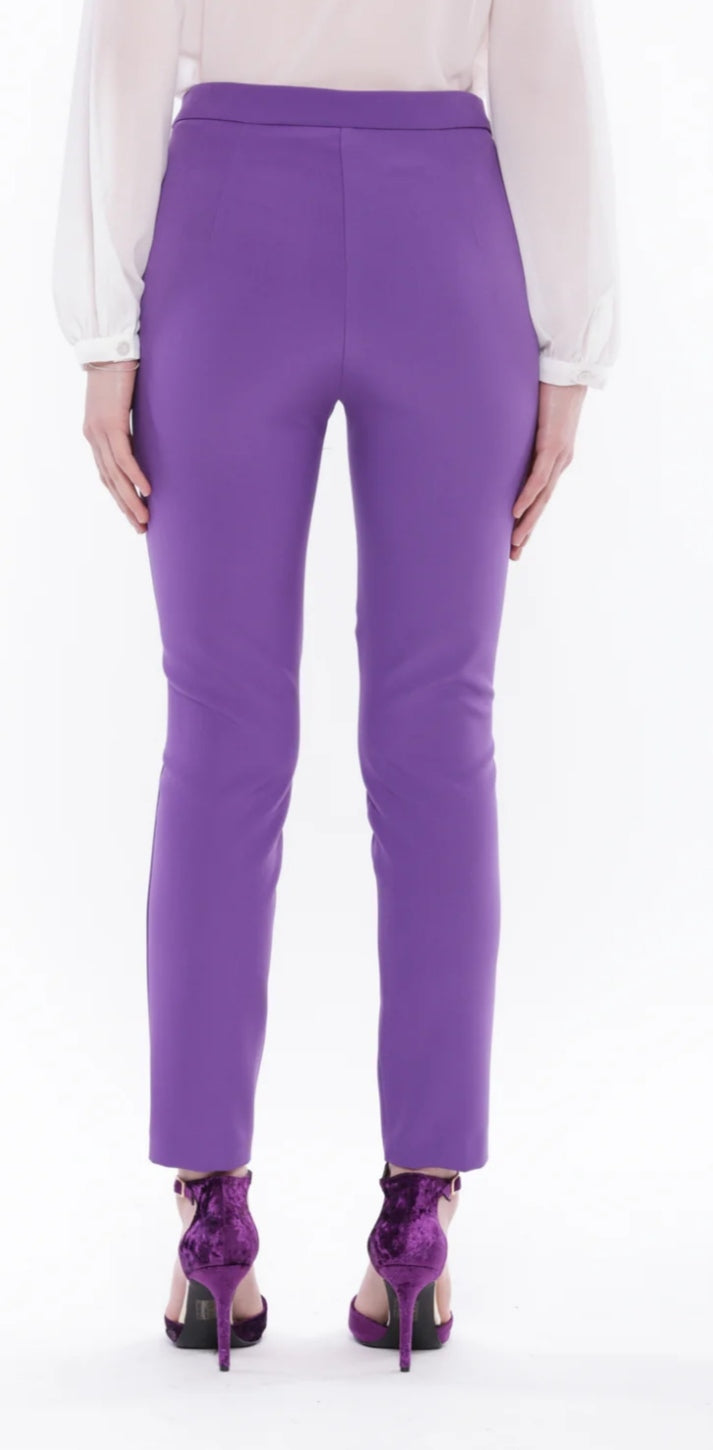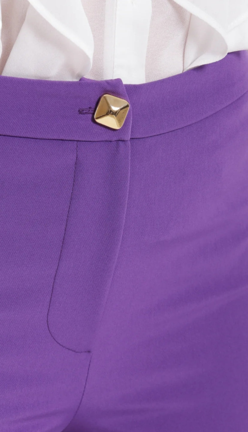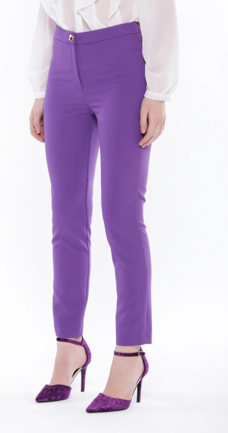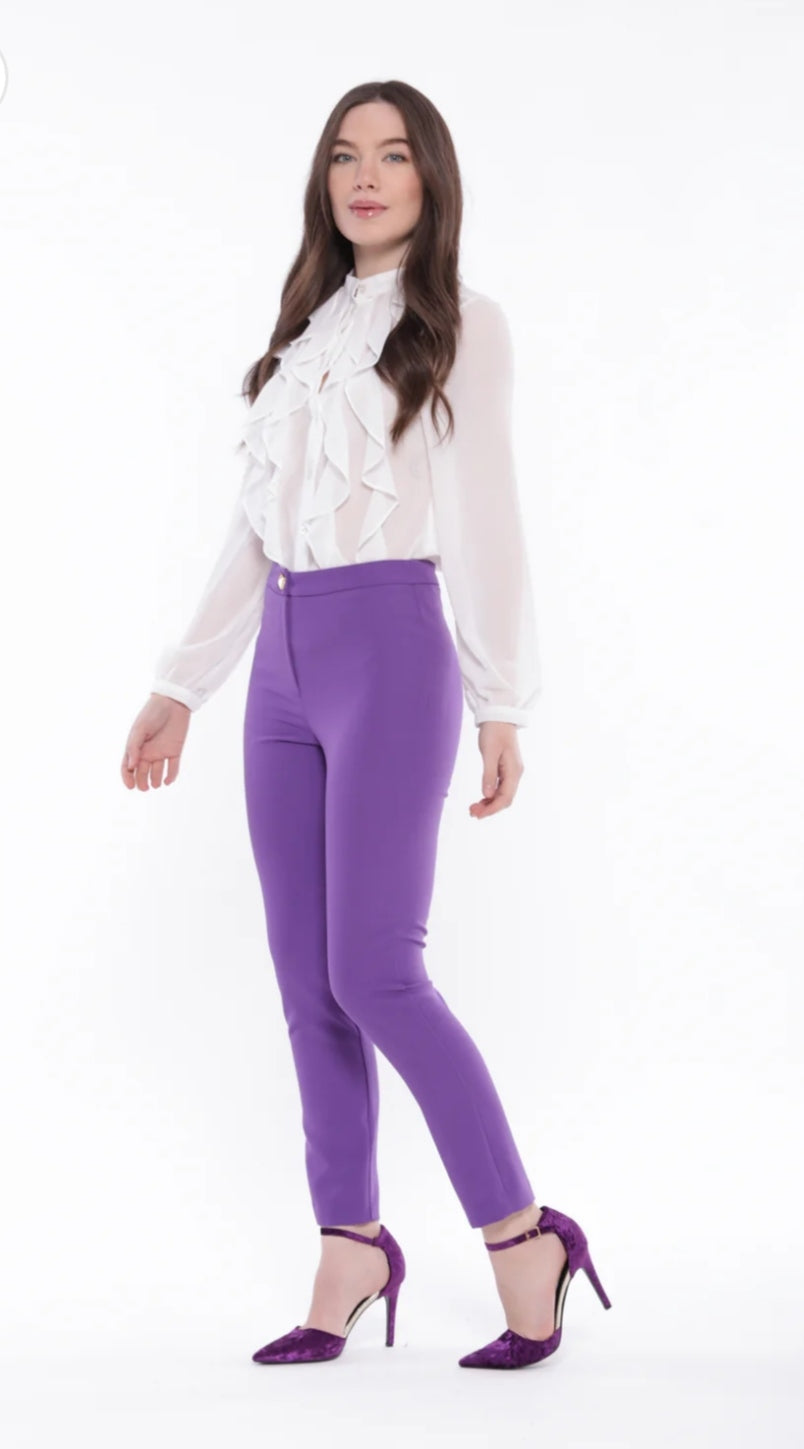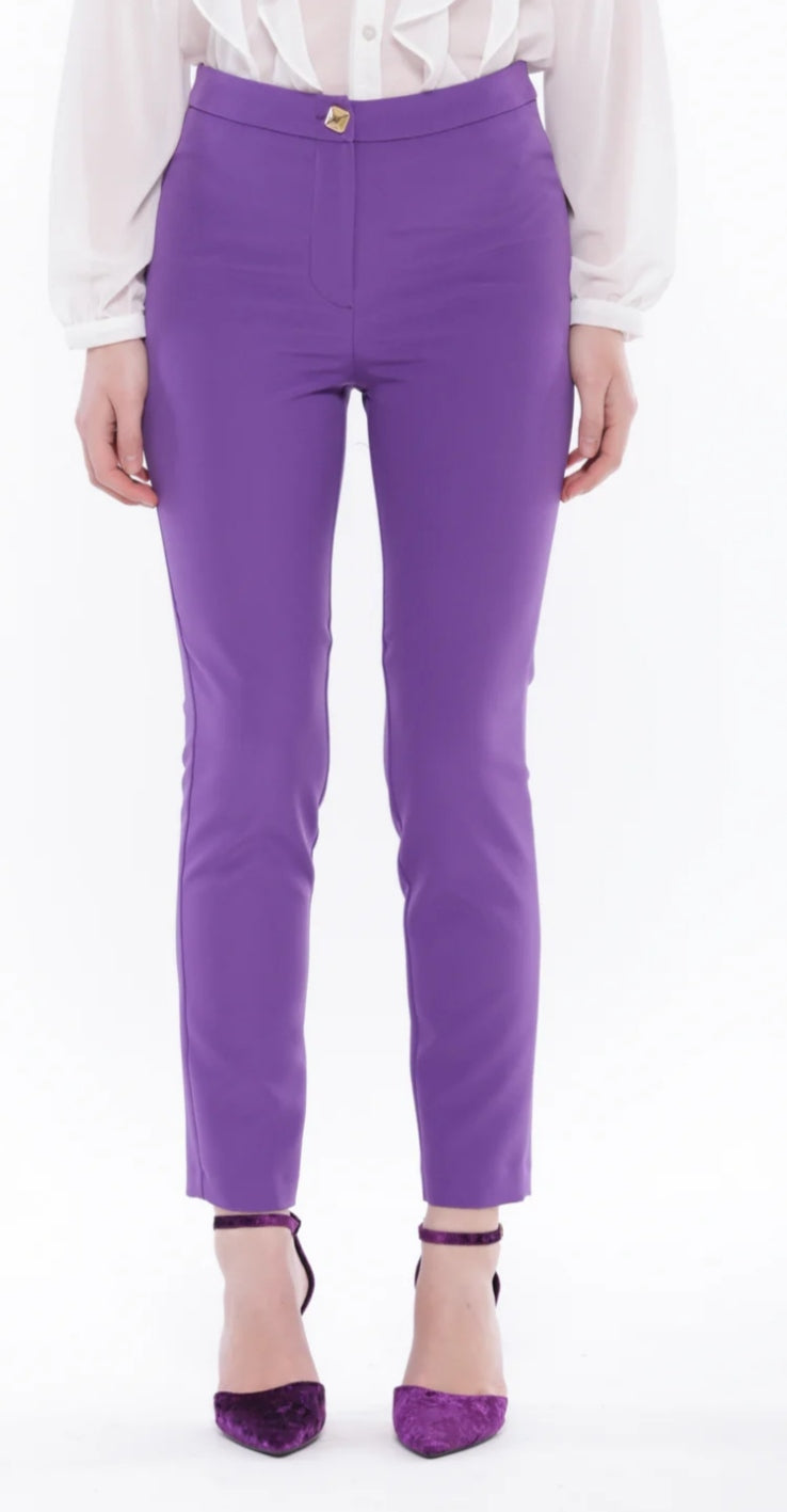 Pantalón ajustado de color vivo. Cierre botón dorado y cremallera.