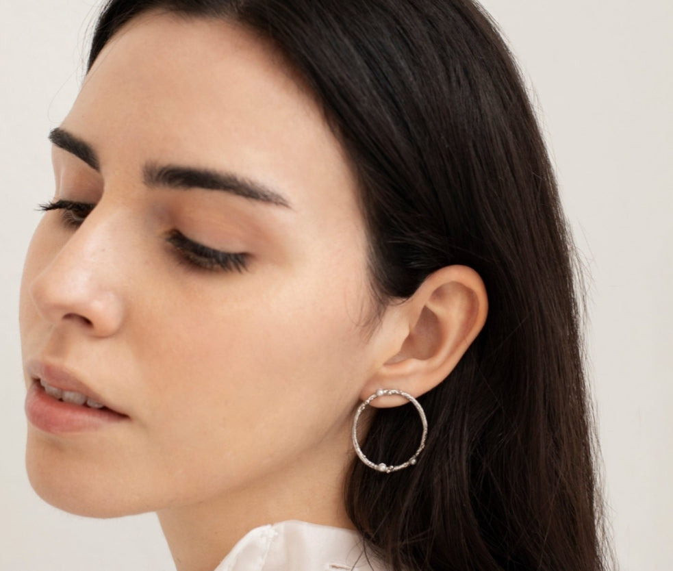 Pendientes circulares en plata texturizados con detalles de bolitas de metal y perlas de resina delicadas. En plata de 925 con baño de platino. Cierre de presión.