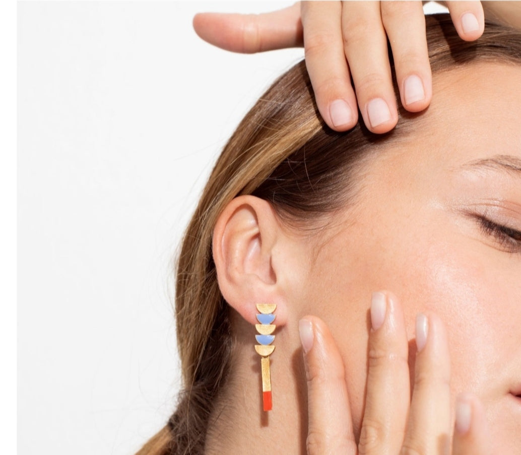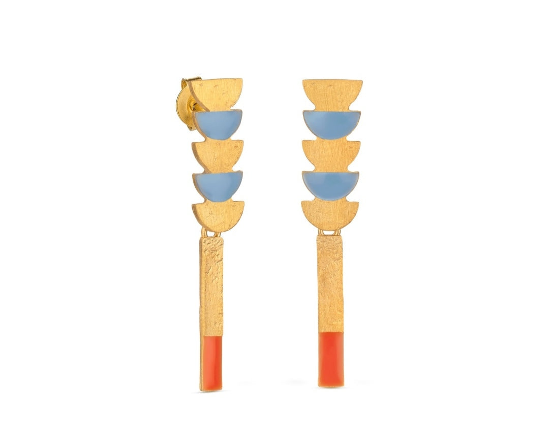 Pendientes geométricos medianos dorados que combinan colores intensos y formas diferentes que evocan dinamismo y serenidad. Cierre con presión. En metal mate con baño de oro de 24K y esmalte frío.