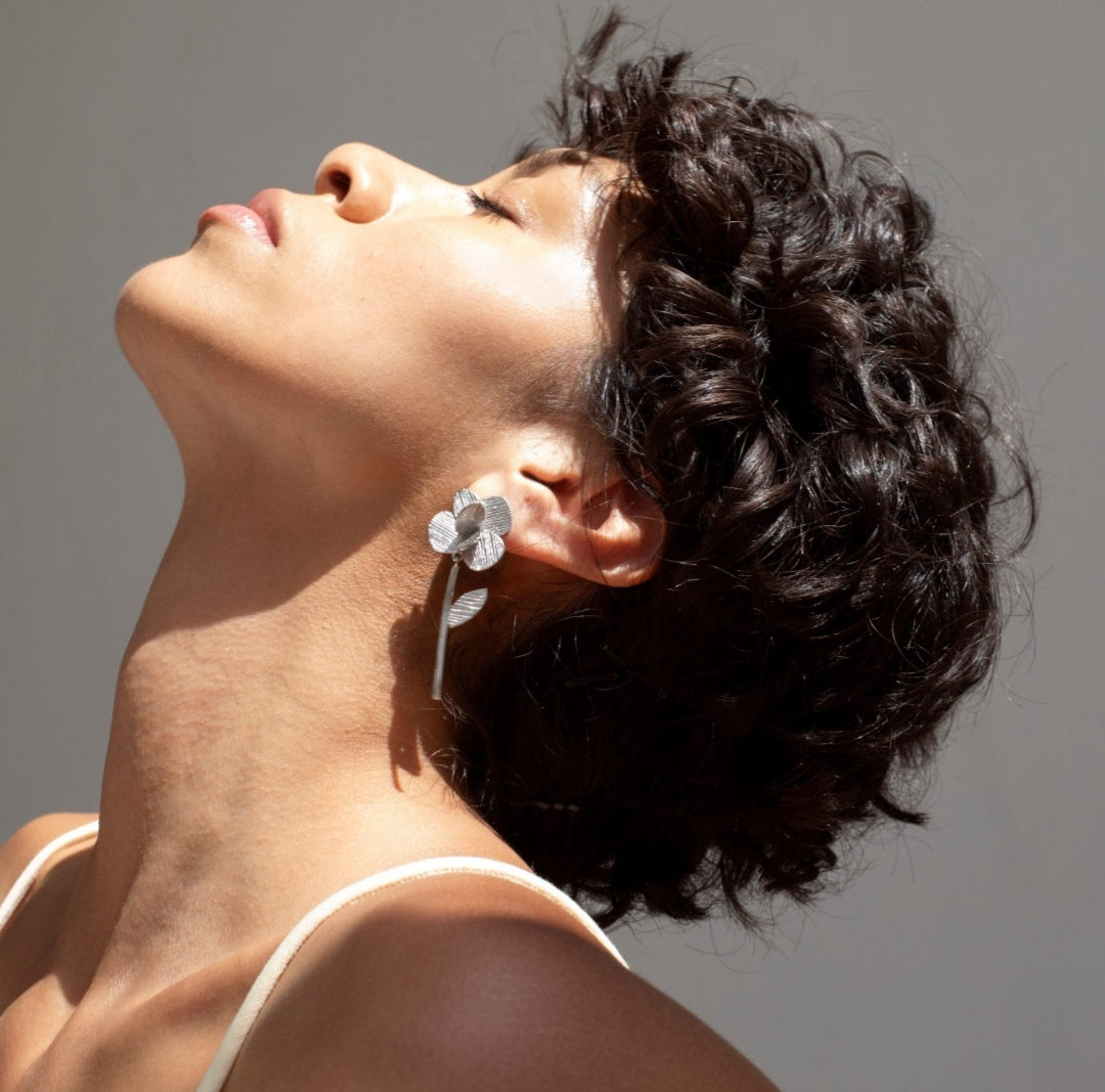 Pendientes Pampalonia de plata que rinden homenaje a la belleza efímera de la peonía silvestre de Mallorca . Pendiente con tuerca y el tallo tiene movimiento. Diseño texturado. Cierre a presión.