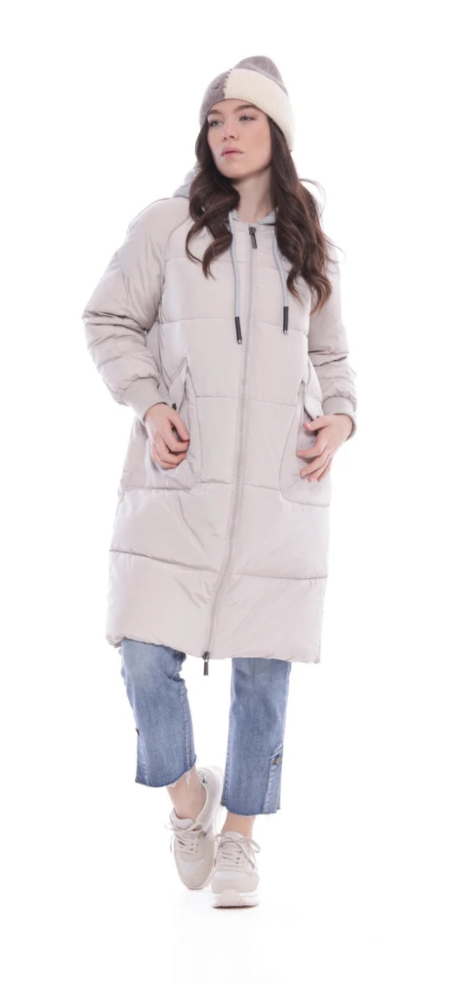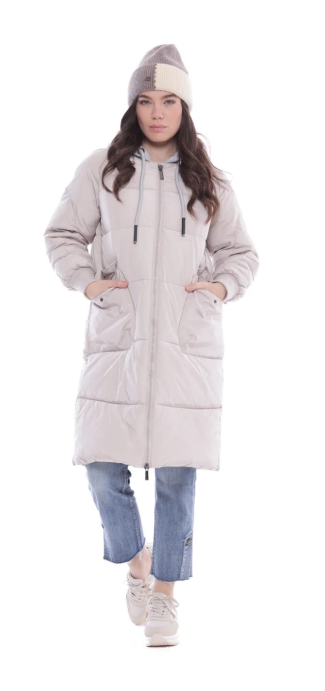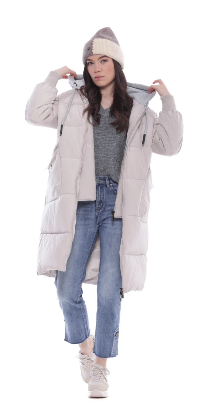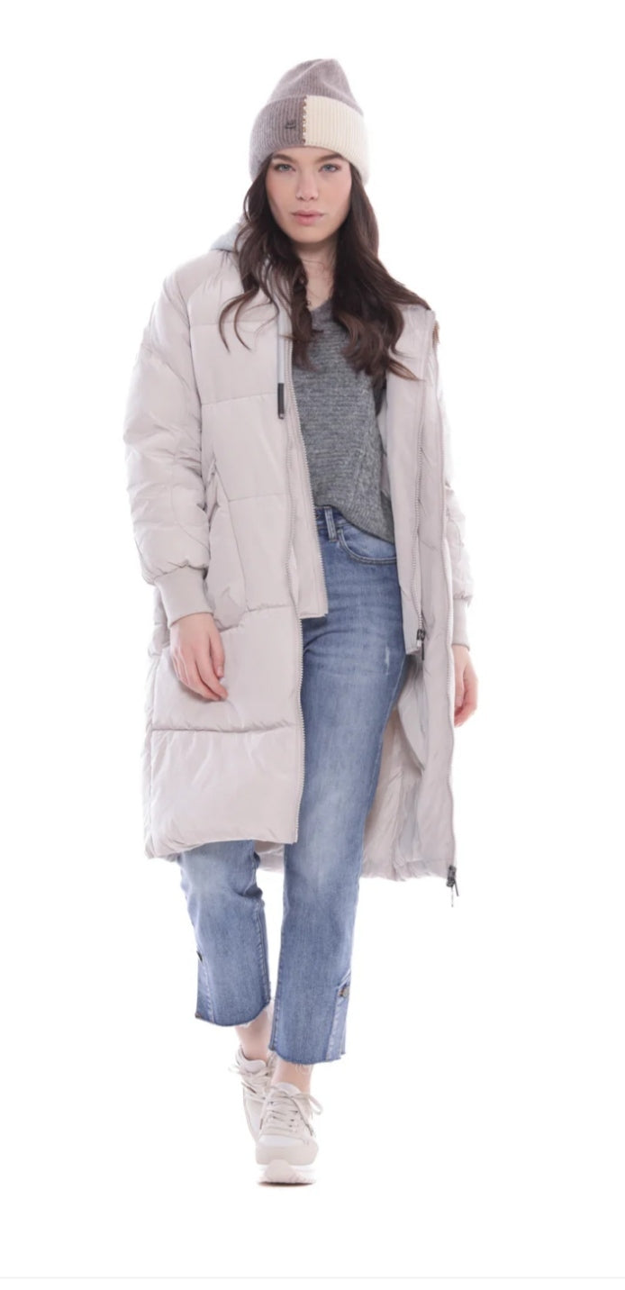 Plumas largo de color claro con capucha tipo sudadera en color gris claro. Cierre de cremallera.