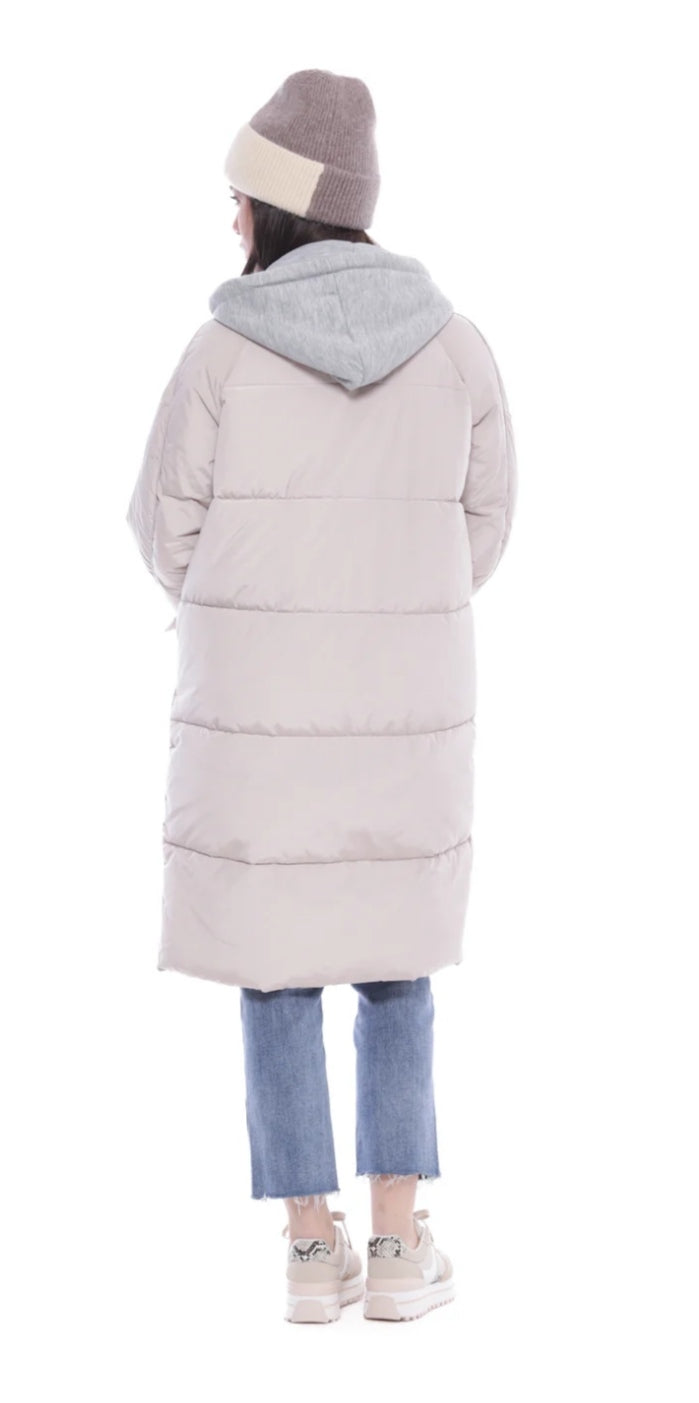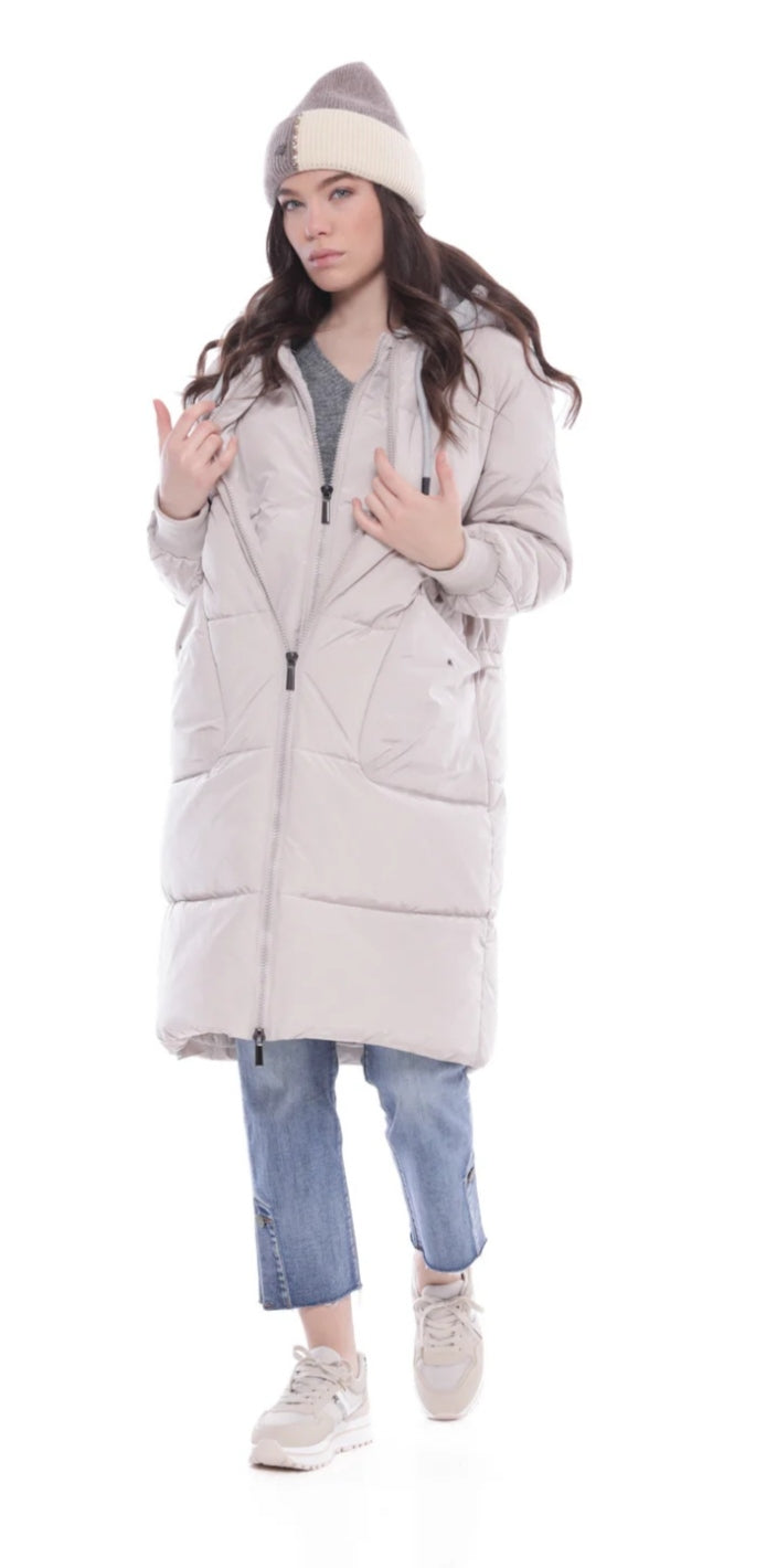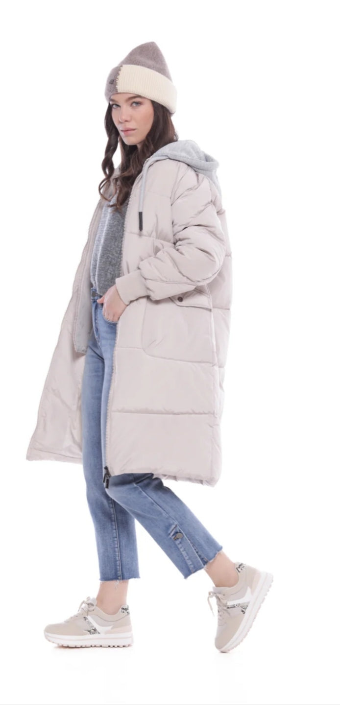 Plumas largo de color claro con capucha tipo sudadera en color gris claro. Cierre de cremallera.