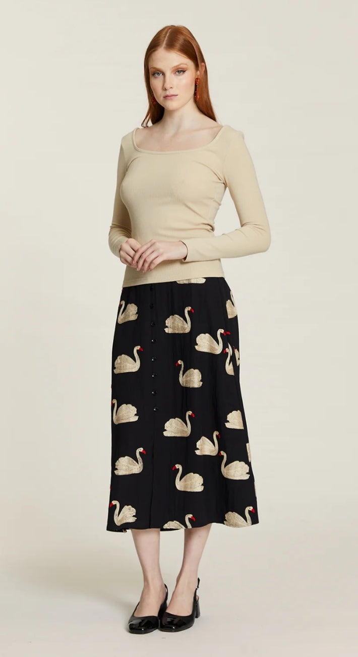 Top bailarina canalé beige con manga larga, cuello scoop , a la altura de la cadera.