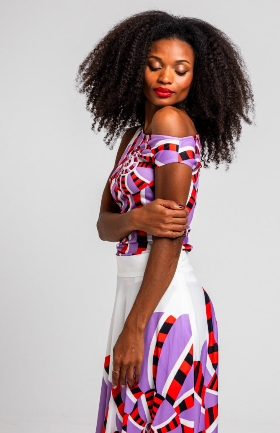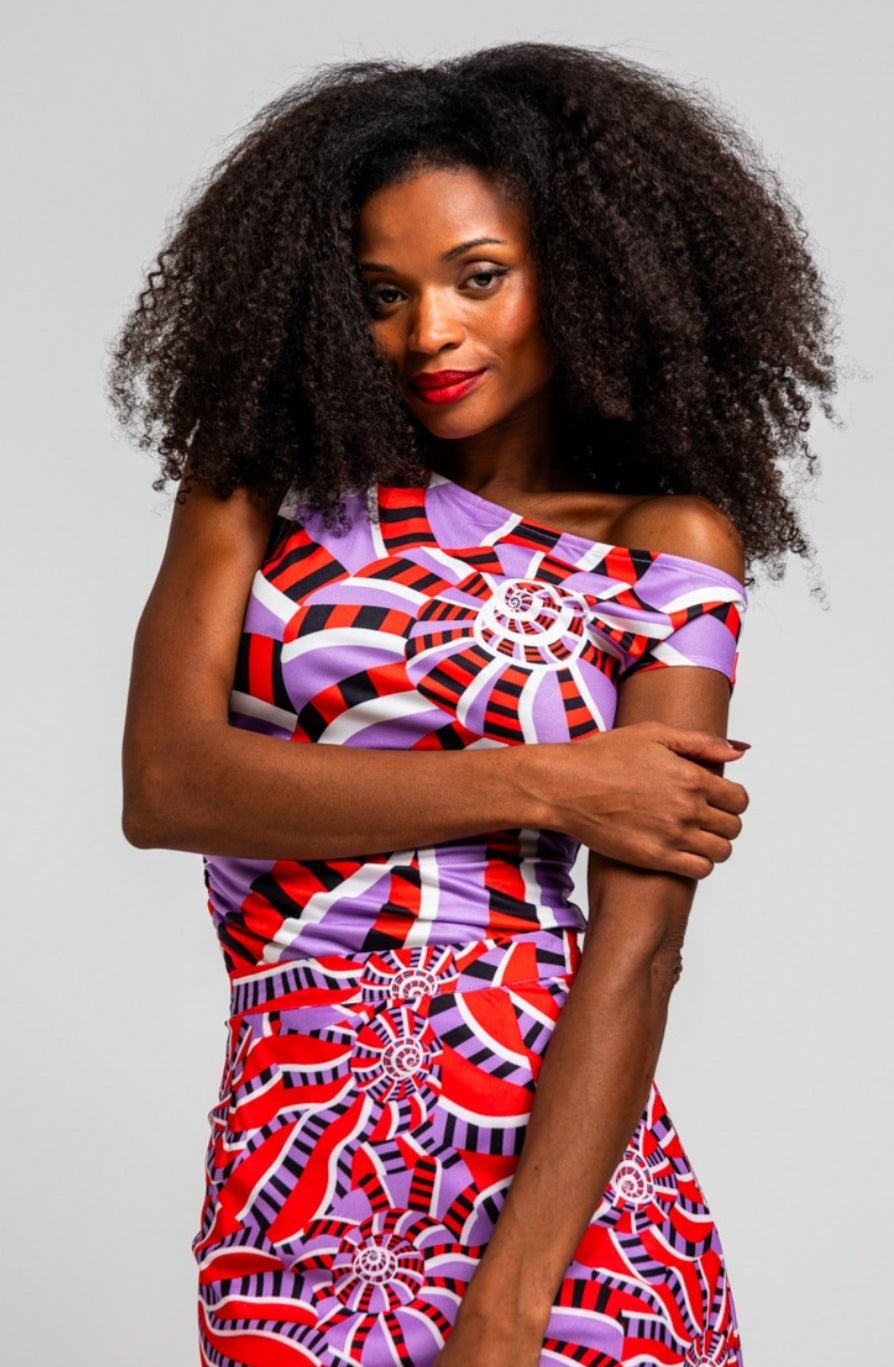 Top asimétrico de escote asimétrico de un sólo hombro y manga sisa en tejido elástico. Diseñado con corte entallado con detalle de frunces en hombros y bajo pecho creando un efecto de drapeado.