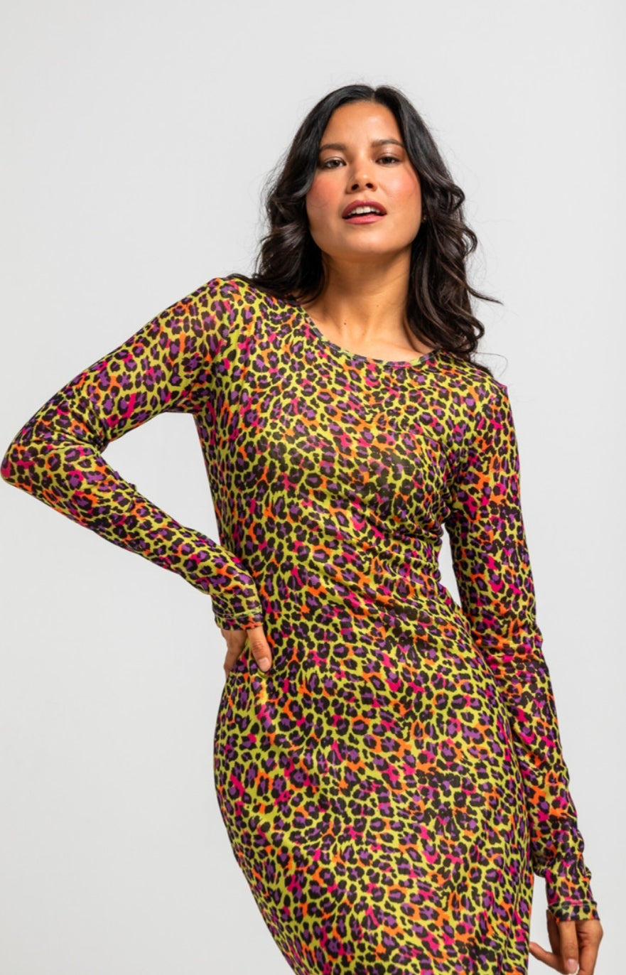 Vestido tul entallado, largo de tejido elástico y manga larga.